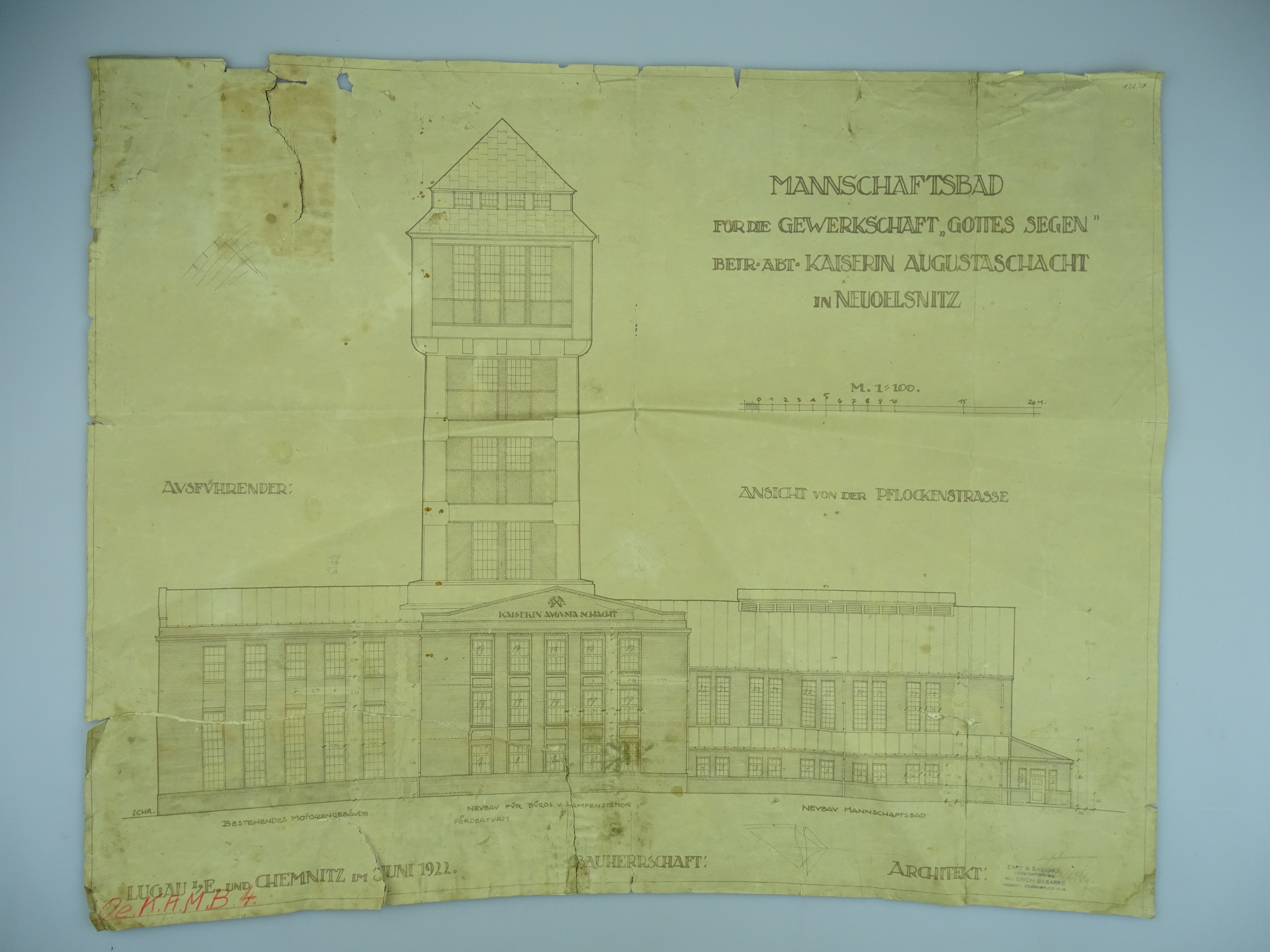 Wir leben im digitalen Zeitalter. Smartphones, Tablets oder Computer erstellen in kürzester Zeit Bilder, Pläne oder Skizzen. Der Bediener oder die Bedienerin des Geräts ist lediglich für die Eingabe der richtigen Daten zuständig. In der Arbeitswelt des beginnenden 20. Jahrhunderts war das Bild im wahrsten Sinne des Wortes noch ein ganz anderes. Ein sehr schönes Beispiel dafür und aus diesem Grund das erste Objekt des Monats 2020, ist eine Architekturzeichnung von Förderturm, Schachthaus, Umformerhalle und Mannschaftsbad des Kaiserin-Augusta-Schachtes aus dem Jahr 1922.
