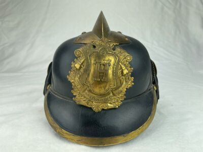 Die Kopfbedeckung besteht größtenteils aus gepresstem Leder. Das „H“ auf dem Emblem auf der Vorderseite zeigt, dass es sich um einen Helm der Freiwilligen Feuerwehr Hohndorf handelt, die 1884 gegründet wurde und nächstes Jahr ihr 140-jähriges Jubiläum feiern wird.