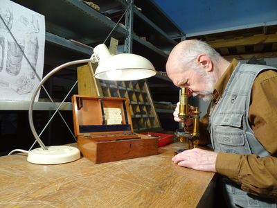 Die Abbildung zeigt außerdem Hartmut Tauscher bei der Arbeit. Er ist Geologe und war bis 2008 Kustos der Mineraliensammlung der Städtischen Museen Zwickau. Seit 2012 unterstützt der nunmehrige Rentner das Bergbaumuseum in der Abteilung Geologie.