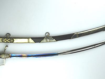 Die „Einkleidungs- und Paradedienst-Ordnung für den Knappschaftsverband auf den Werken des Erzgebirgischen Steinkohlen-Actienvereines“ von 1854 schrieb genau vor, wie die Uniformen, Hüte sowie Paradebewaffnung auszusehen hatten und wie sie getragen wurden. „Der Säbel mit neusilbernem Gefäße ohne Korb hat eine schwarze Lederscheide mit neusilbernem die Berginsignien tragenden Beschläge, ein silbernes einfarbiges Porte-epée von der Stärke der Armtour, bei den Officianten der ersten beiden Classen…“, so in der oben genannten Paradeordnung festgeschrieben. Am Klingenrücken ist die Gravur des Herstellers „E. L. Voigt in Dresden“ sehr gut zu erkennen. Dieser namenhafte Schwertfeger, so die Bezeichnung dieses Handwerkerberufs, ist ab 1816 nachweislich bekannt und wirkte unter anderem am Haupt-Zeughaus in Dresden. Richard Wagner selbst soll einen Säbel bei Voigt in Auftrag gegeben haben.