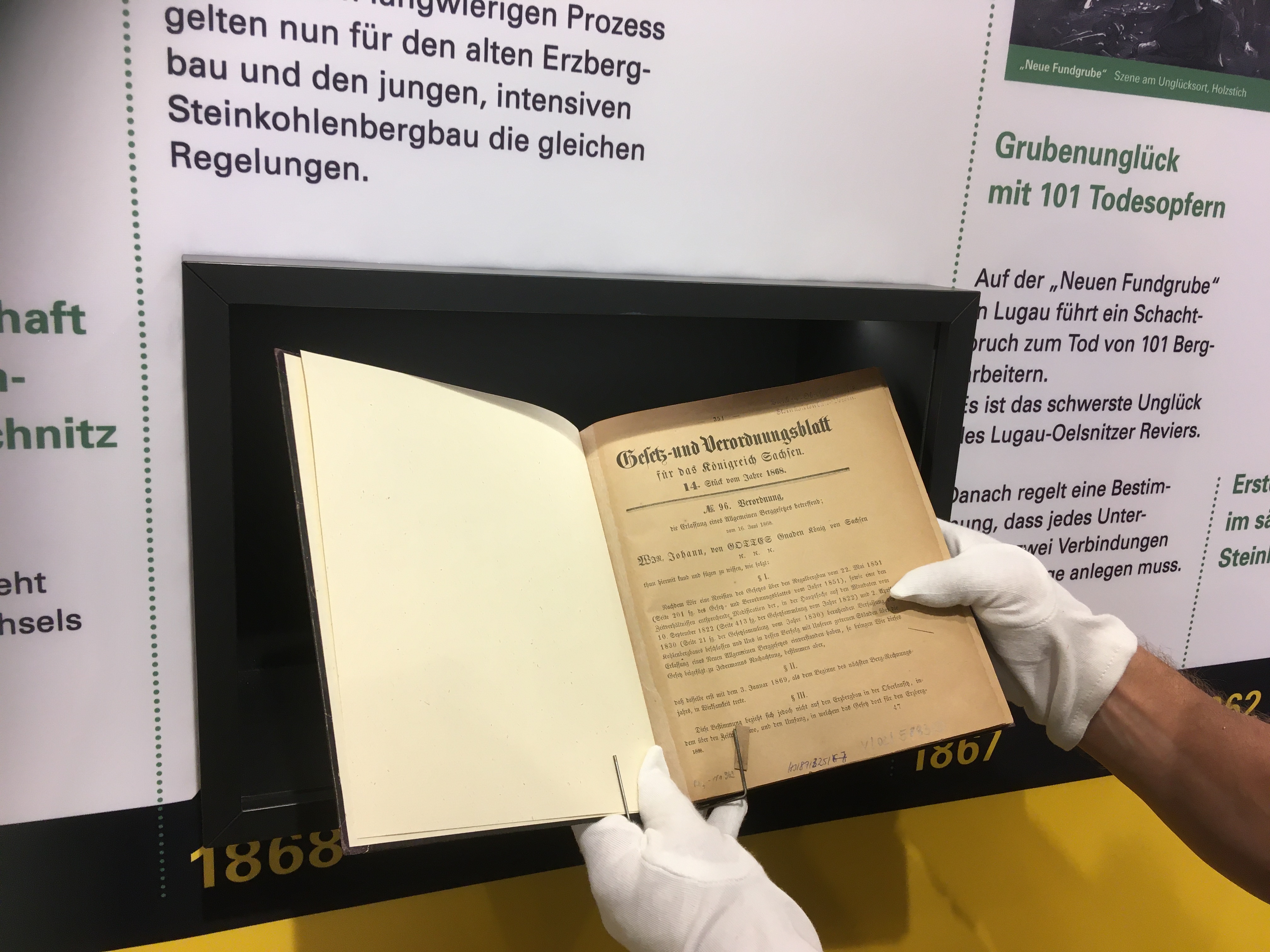 Diese besondere Form der Sonderausstellung nimmt das Museumsteam zum Anlass, bis zum Ende der Ausstellung am 31. Dezember 2020 jeden Monat ein besonderes Objekt sowie den entsprechenden Bereich der Sonderschau vorzustellen. Die Wahl des ersten Objektes für den Monat Juli fiel dabei auf jenes Exponat, welches gewisser Maßen in letzter Minute – am Morgen des Eröffnungstages – seinen Platz in der Vitrine fand. Das Allgemeine Berggesetz für das Königreich Sachsen von 1868, ehemals im Besitz des Zwickau-Oberhohndorfer Steinkohlenbauvereins, war vom Restaurator selbst kurz vor Ausstellungseröffnung an Ort und Stelle platziert worden. Dieser hatte es noch eigens für die Landesausstellung von kleinen, altersbedingten Schönheitsfehlern befreit.