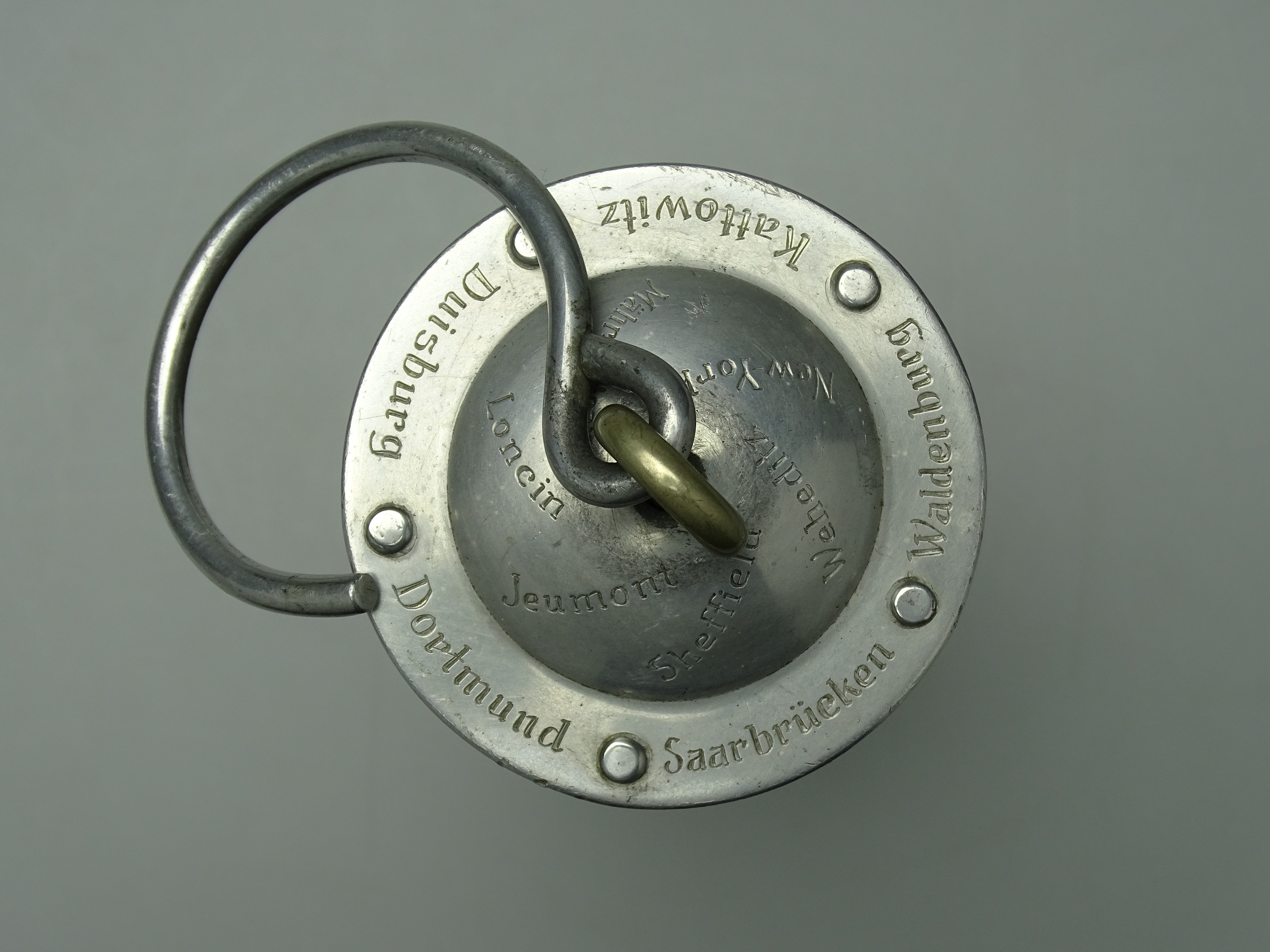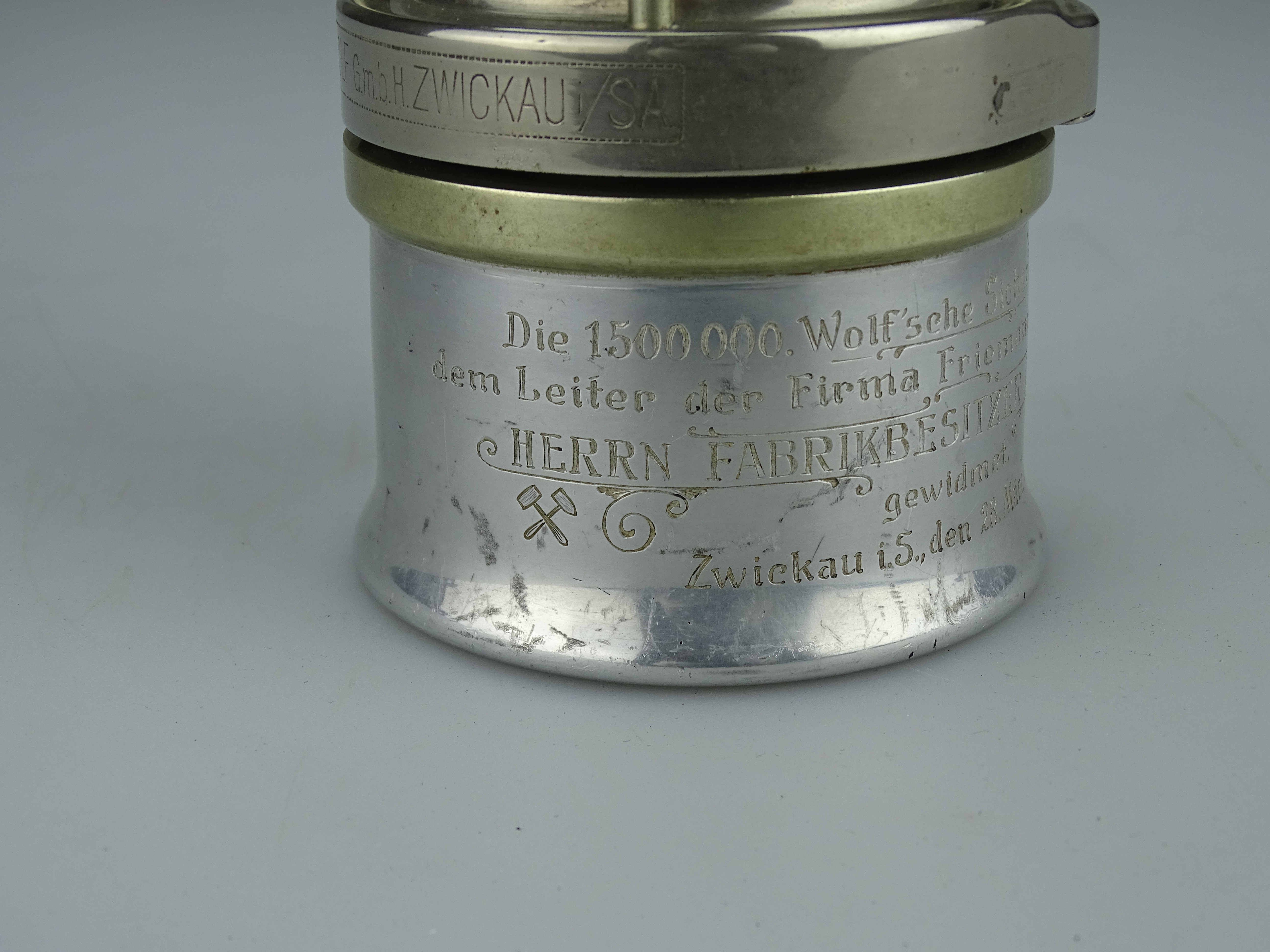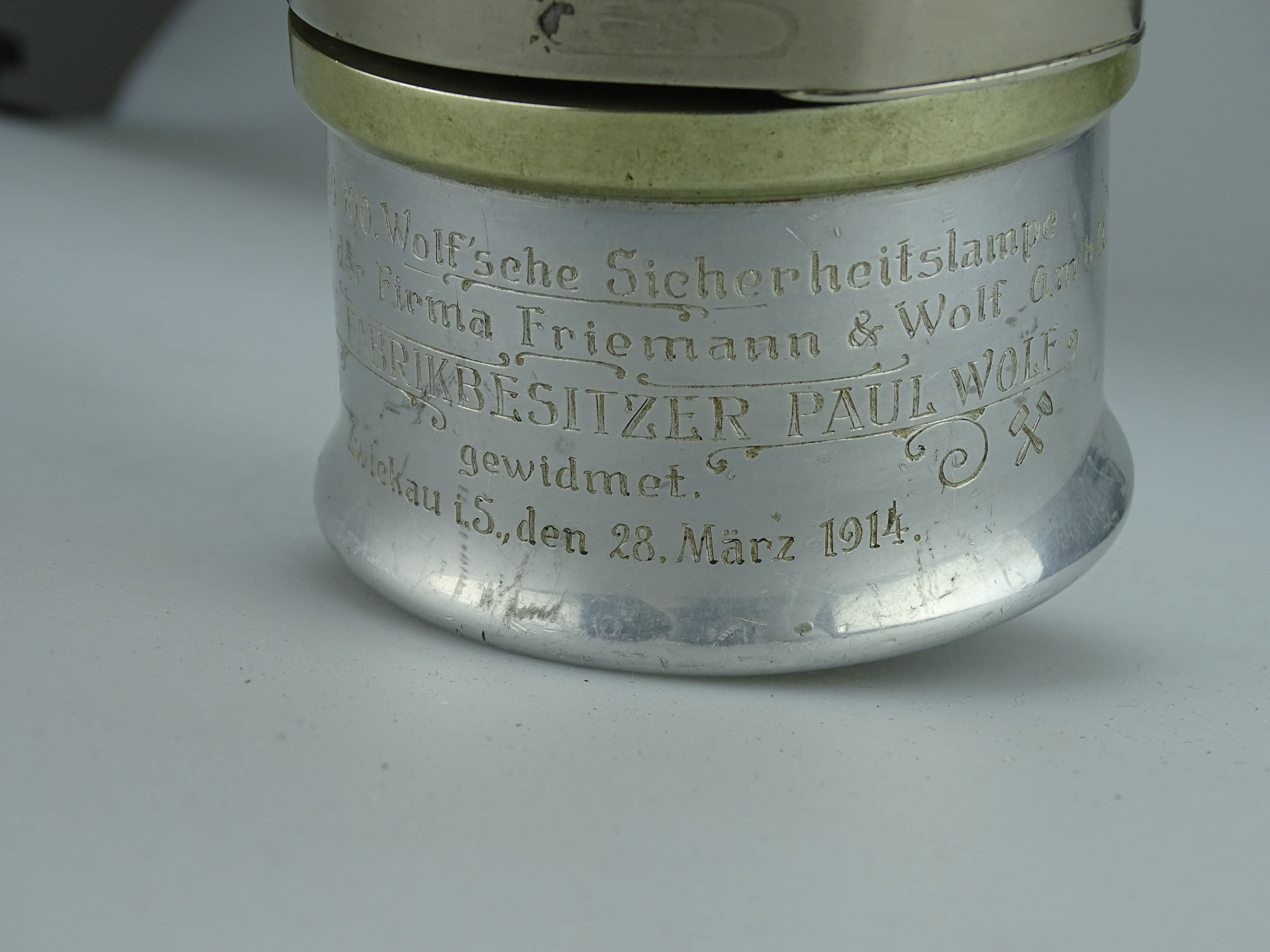 Gemeinsam mit Heinrich Friemann gründete Carl Wolf 1884 die Maschinen- und Grubenlampenfirma Friedmann & Wolf. Dieses Unternehmen wuchs schnell und war international erfolgreich. Dies verdeutlicht das Objekt des Monats. Wie die Inschrift auf dem Sockel zeigt, handelt es sich um die 1.500.000 Benzin-Sicherheitslampe des Unternehmens Friemann & Wolf. Sie wurde am 28. März 1914 dem damaligen Fabrikbesitzer Paul Wolf gewidmet. Auf dem Gestelldeckel sind die Orte der Tochtergesellschaften - New York, Weheditz, Mähren, Loncin, Jeumont und Sheffield - eingraviert. Darum herum reihen sich die Orte der Niederlassungen: Dortmund, Saarbrücken, Waldenburg, Kattowitz und Duisburg.