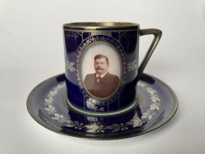 Tasse mit Untertasse zur Erinnerung an das 25-jährige Jubiläum der Porzellanfabrik Friedrich Kaestner
