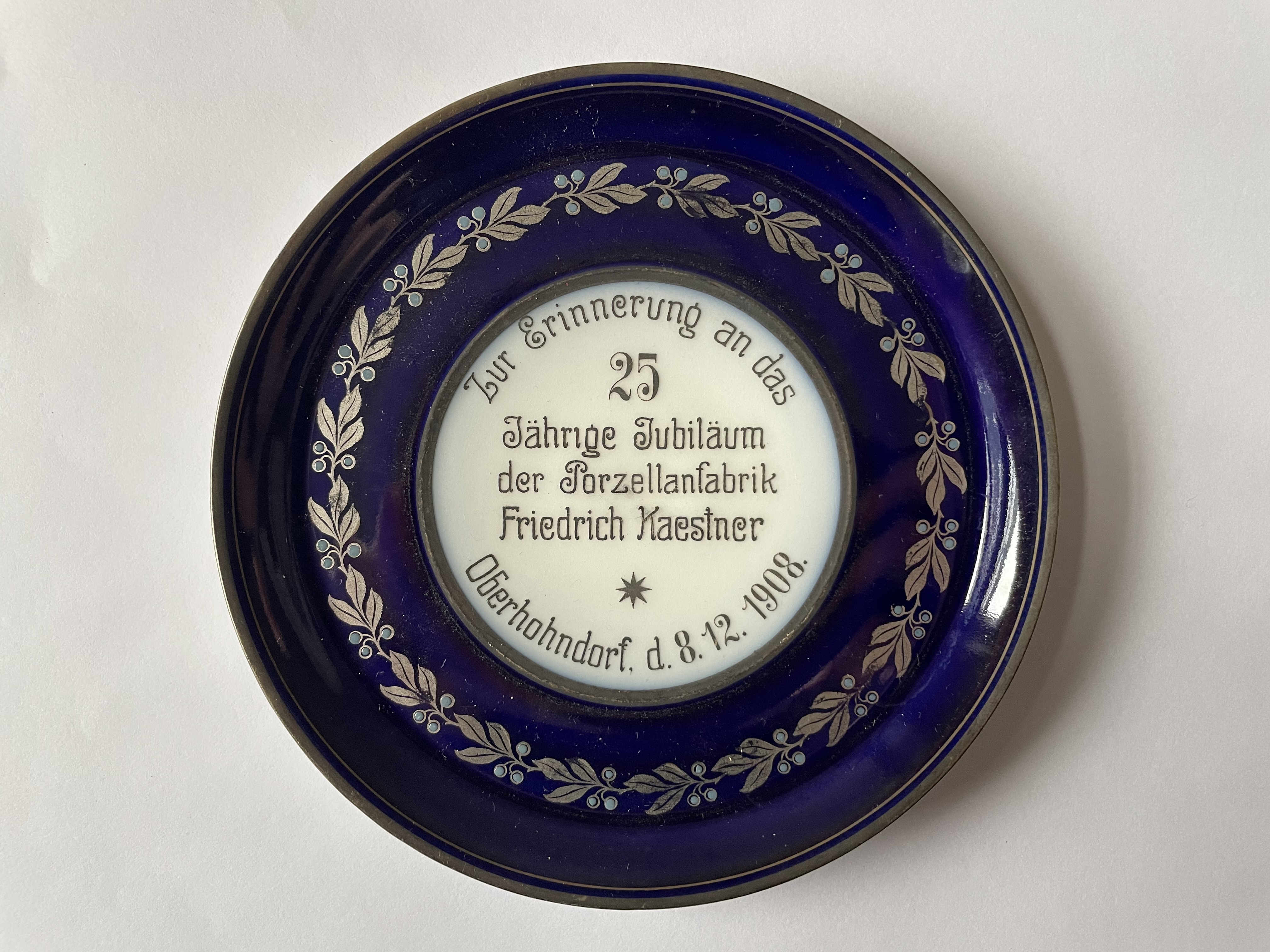 Daher gründete er 1882 in Oberhohndorf die Porzellanfabrik Friedrich Kaestner für seinen Sohn Friedrich. Dieser wurde im folgenden Jahr alleiniger Besitzer des Unternehmens. Die Aufschrift auf dem Objekt des Monats bezieht sich also auf das Jahr der Übernahme 1883.