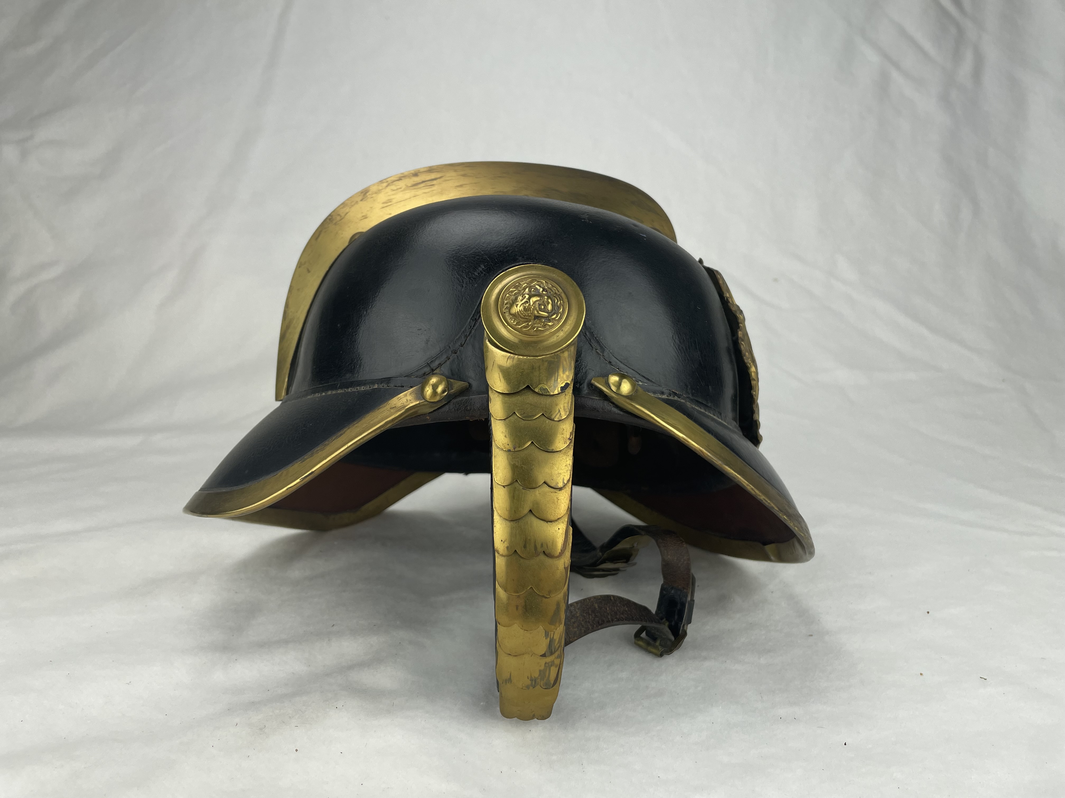 Die Kopfbedeckung besteht größtenteils aus gepresstem Leder. Das „H“ auf dem Emblem auf der Vorderseite zeigt, dass es sich um einen Helm der Freiwilligen Feuerwehr Hohndorf handelt, die 1884 gegründet wurde und nächstes Jahr ihr 140-jähriges Jubiläum feiern wird.