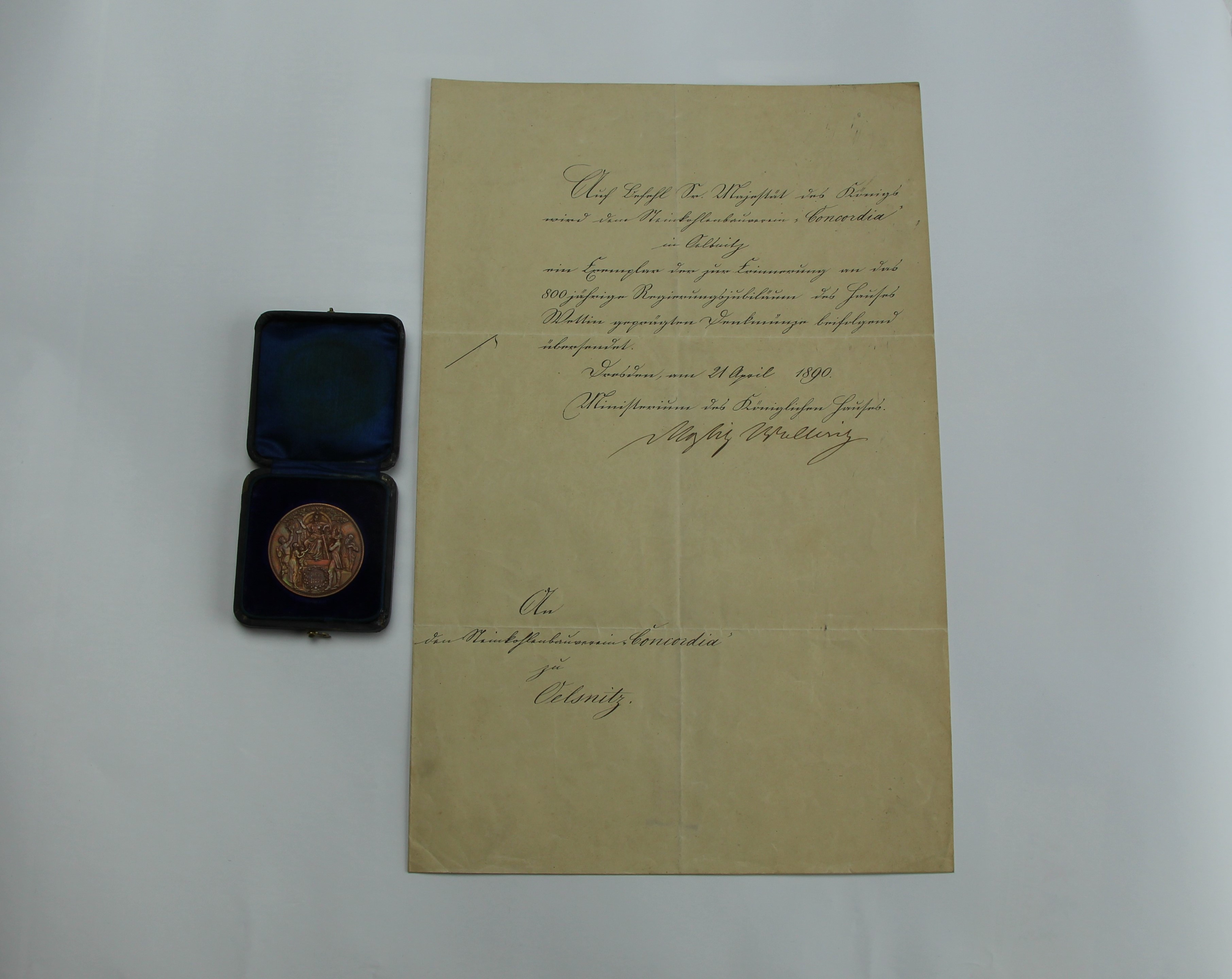 Auch der Steinkohlenbauverein Concordia war an dem Festzug beteiligt und bekam als Erinnerung diese Medaille überreicht. Dies belegt das zugehörige Schreiben des Ministeriums des Königlichen Hauses vom 21. April 1890, das ebenfalls im Bestand des Bergbaumuseums ist.
