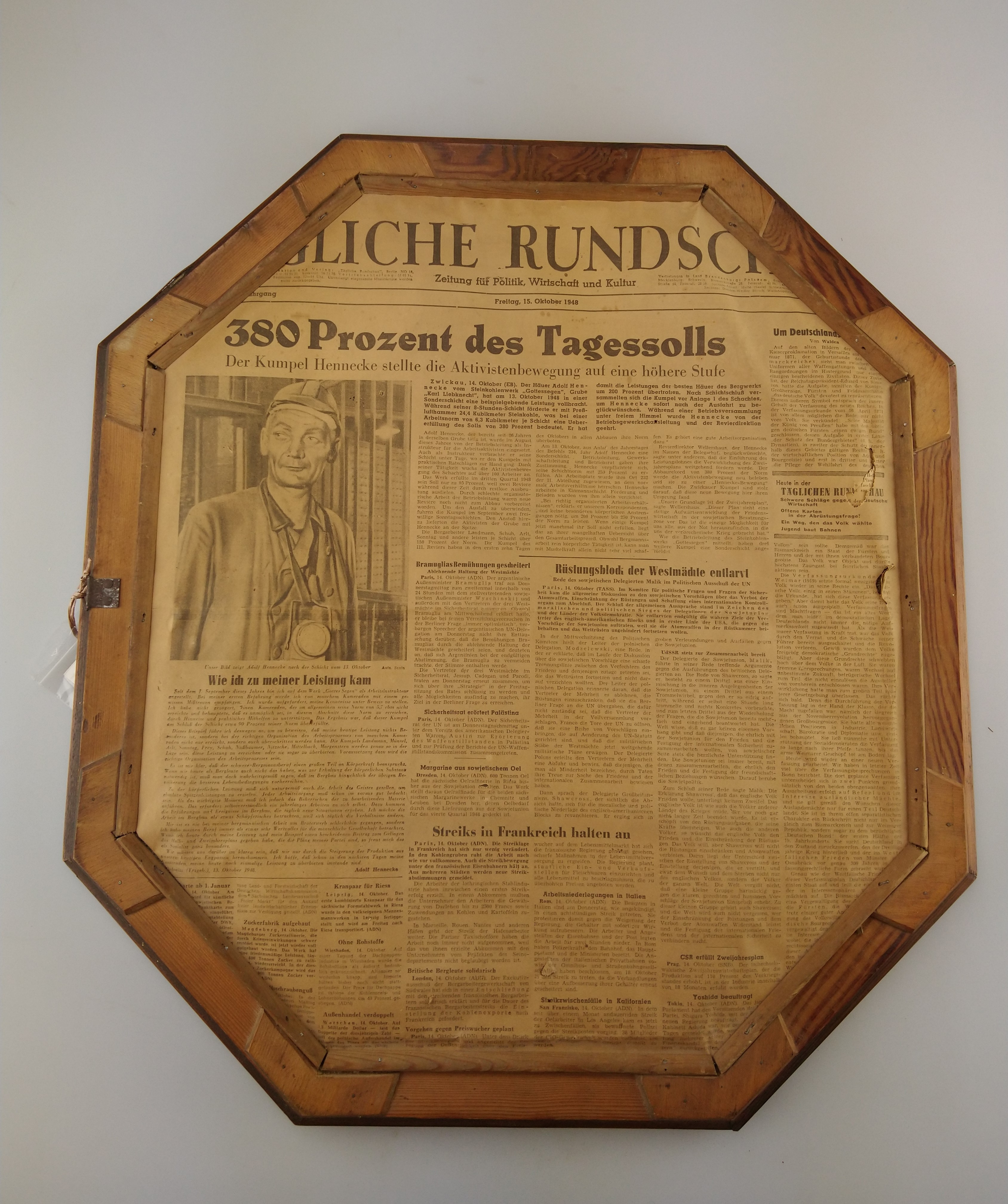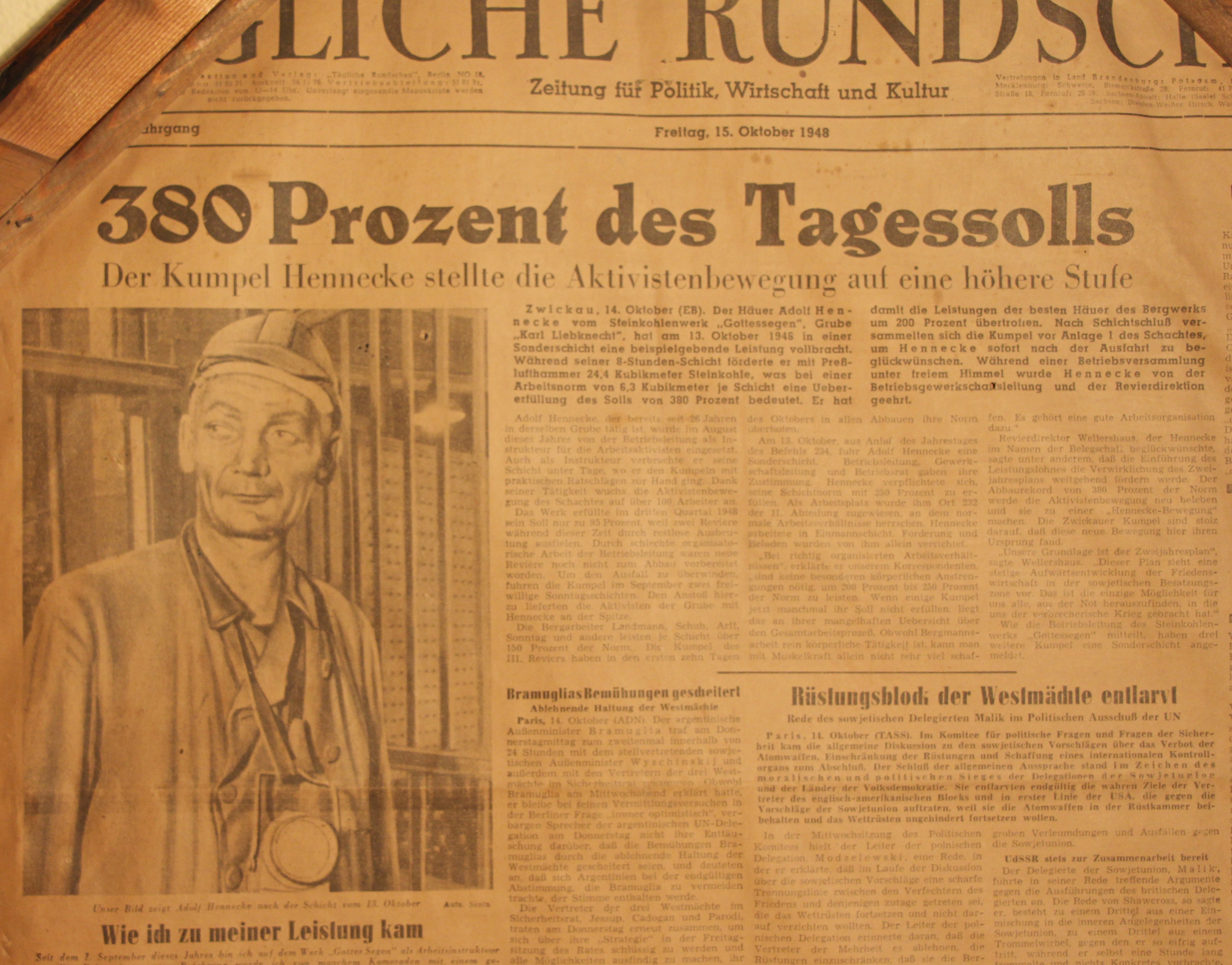 Auf der Rückseite des Bildes ist ein Zeitungsausschnitt zu sehen. Es handelt sich um einen Teil des Titelblatts der „Tägliche Rundschau“ vom 15. Oktober 1948. Einer der Artikel berichtet über die Hochleistungsschicht Adolf Henneckes.