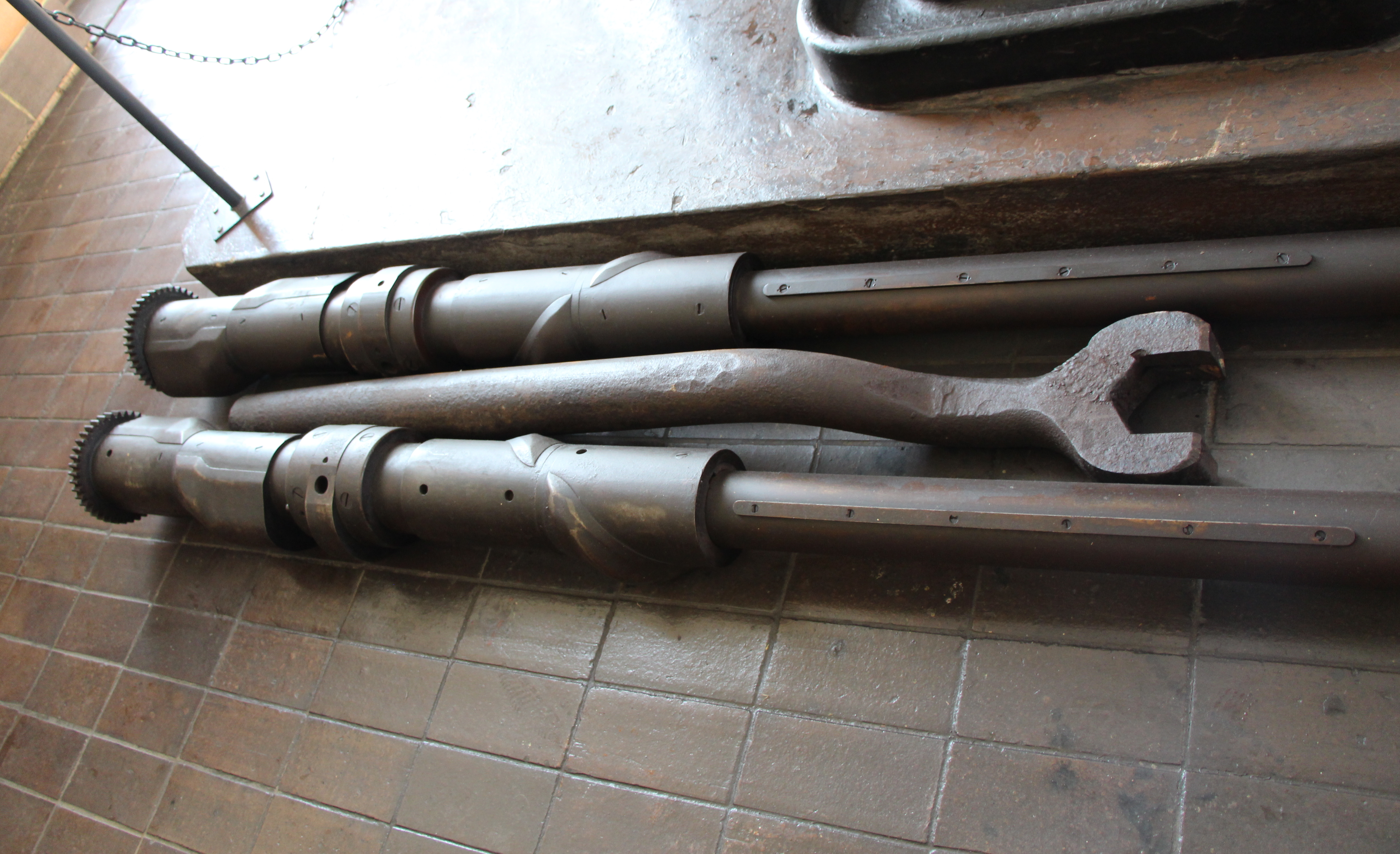 Große Maschinen benötigen große Werkzeuge. So liegt es nahe, dass zum Aufbau sowie für Reparaturarbeiten an der hiesigen Dampfmaschine keine handelsüblichen Geräte verwendet wurden. Das ca. 150kg schwere Werkzeug mit einer Maulweite von 11 cm wurde vermutlich eigens für die Dampfmaschine hergestellt.