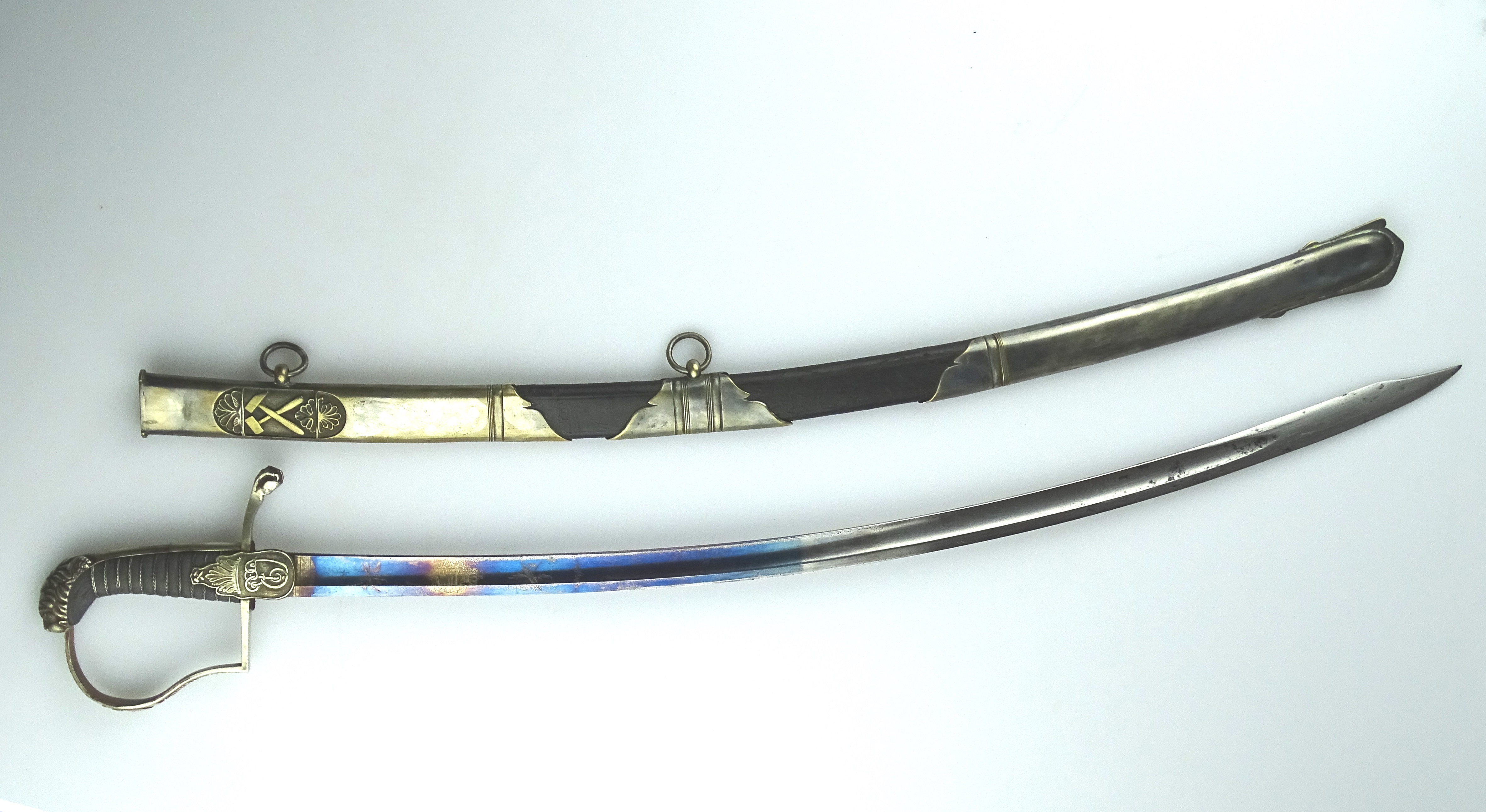 Die „Einkleidungs- und Paradedienst-Ordnung für den Knappschaftsverband auf den Werken des Erzgebirgischen Steinkohlen-Actienvereines“ von 1854 schrieb genau vor, wie die Uniformen, Hüte sowie Paradebewaffnung auszusehen hatten und wie sie getragen wurden. „Der Säbel mit neusilbernem Gefäße ohne Korb hat eine schwarze Lederscheide mit neusilbernem die Berginsignien tragenden Beschläge, ein silbernes einfarbiges Porte-epée von der Stärke der Armtour, bei den Officianten der ersten beiden Classen…“, so in der oben genannten Paradeordnung festgeschrieben. Am Klingenrücken ist die Gravur des Herstellers „E. L. Voigt in Dresden“ sehr gut zu erkennen. Dieser namenhafte Schwertfeger, so die Bezeichnung dieses Handwerkerberufs, ist ab 1816 nachweislich bekannt und wirkte unter anderem am Haupt-Zeughaus in Dresden. Richard Wagner selbst soll einen Säbel bei Voigt in Auftrag gegeben haben.