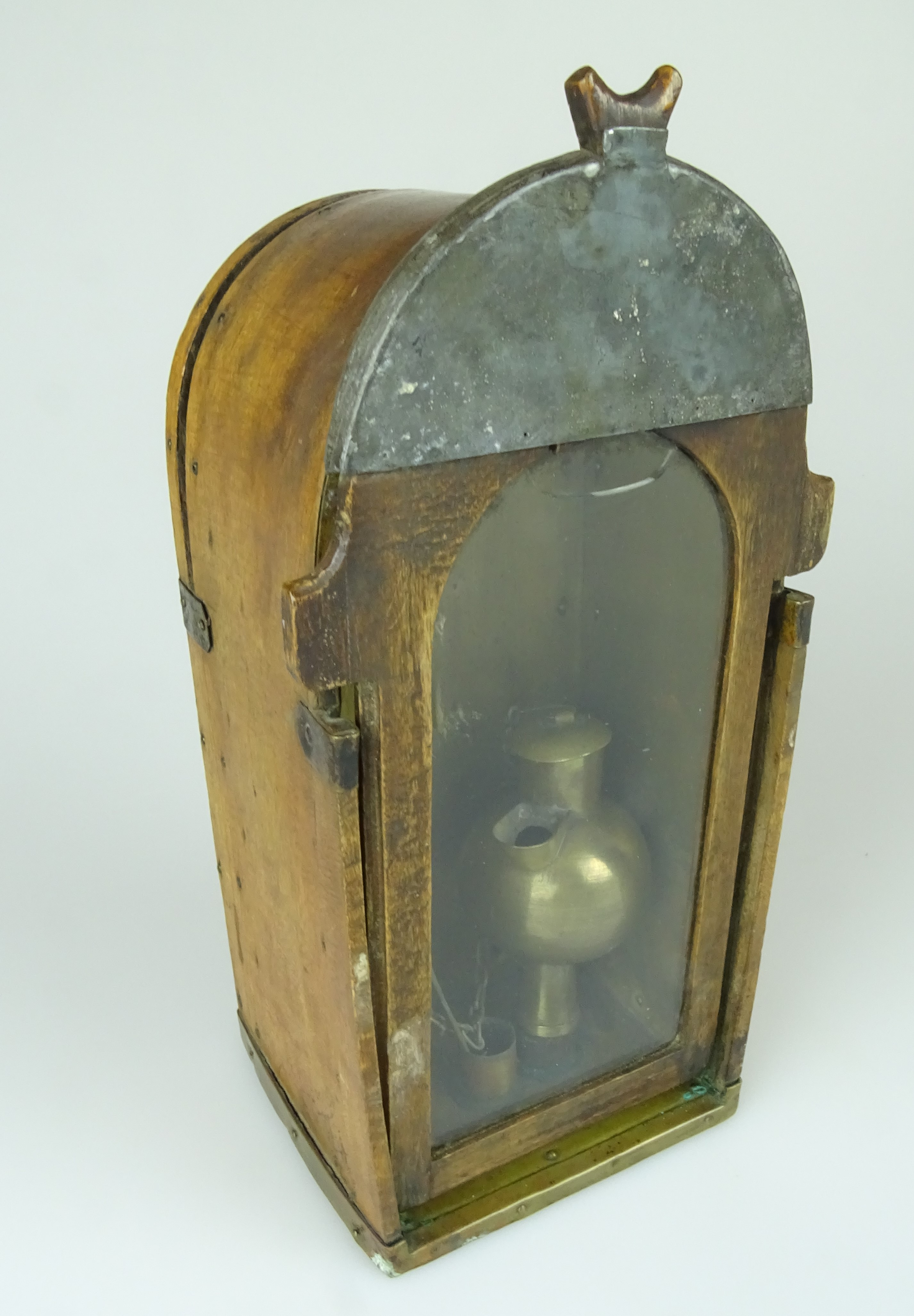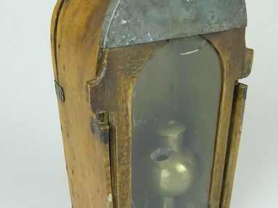 Bereits Mitte des 18. Jahrhunderts wurden Blenden, wie das gezeigte Exemplar, in Sachsen nachweislich verwendet. Da sie das für die Arbeit unter Tage unerlässliche Licht vor Wetterzug oder Tropfwasser schützten, konnten sich die neuen Lampen schnell flächendeckend verbreiten. Typisch waren die bogenförmig gefertigten Holzkästen mit einer offenen Seite. Diese konnte mit einer in Holz gefassten Glasscheibe verschlossen werden. Für die nicht brennbare Innenauskleidung wurde in der Regel Messingblech verwendet, denn es erhöhte zusätzlich den Schein des Lichtes. Ebenfalls aus Messing waren die kleinen Öllampen im Inneren der Blende. Man nannte sie Kuckuck und sie wurden in der Hauptsache mit sogenanntem Rüböl aber auch Talk und später Petroleum betrieben. Außerdem konnten sie auch außerhalb der Blende verwendet werden. Zusätzlich zur Öllampe war meist eine Vorrichtung zum Einstellen einer Kerze vorgesehen. Löcher in der Rückwand versorgten die Flamme mit ausreichend Sauerstoff. Vor der Rückwand war ein Schlitz zum Verstauen des Glasschiebers vorgesehen. Der an der Rückseite angebrachte Metallhacken diente zum Tragen und Verstauen der Blende an Kleidung oder Gürtel. Das vorliegende Exemplar stammt sehr wahrscheinlich aus dem Besitz eines Beamten, da der Haken aus Kupfer und nicht, wie üblich, aus Eisen gefertigt wurde. Und sein Geleucht schien ihm sehr wichtig, denn der im oberen Bereich gebrochene Schieber wurde sorgfältig mit einer Blechummantelung repariert.