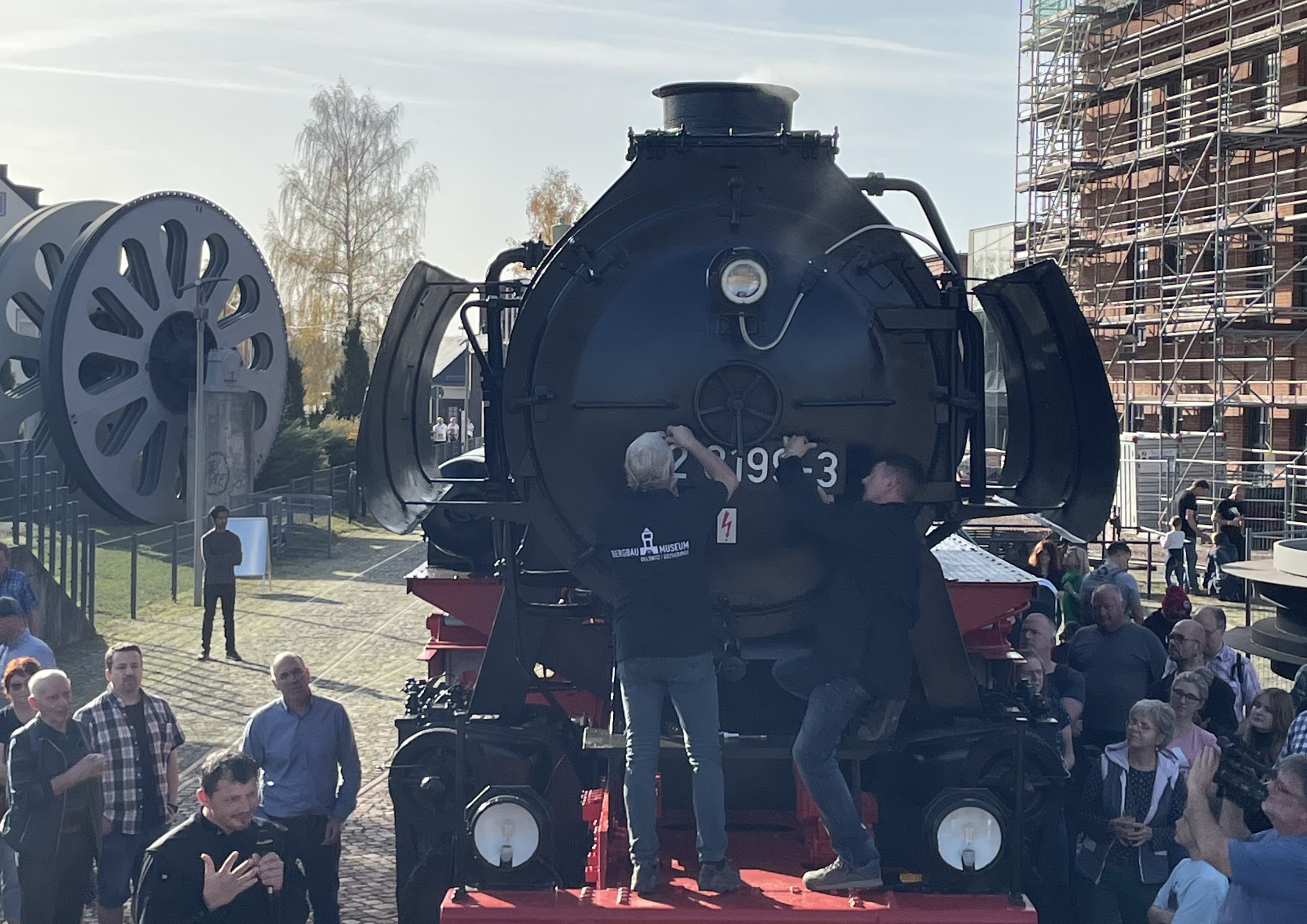 Zu Beginn des Vorhabens im Sommer 2021 stand die Dokumentation aller Bauteile. Denn nach der Demontage und Überarbeitung sollte die Lok auch wieder zusammengebaut werden können. Diese Aufgabe übernahmen die Haustechniker des Museums. Weitere Unterstützung erhielten sie durch externe Firmen. Denn auch große Teile aus Blech mussten aufgearbeitet oder nachgefertigt, Korrosionsschutz und Farbe aufgebracht und die Beschilderung erneuert werden. Eine weitere Herausforderung war die Ergänzung fehlender Bauteile. Die oft sehr umfangreichen Recherchearbeiten lieferten nicht immer das gewünschte Ergebnis und so wurden Anbauteile auch selbst gefertigt, zum Beispiel die Dampfpfeife, welche nun goldenfarbig erstrahlt. Der Abschluss des Projektes wurde nun am letzten Oktoberwochenende mit einer feierlichen „Loktaufe“ bei strahlend blauem Himmel begangen. Dabei wurde als Akt der Taufe das Typenschild wieder angebracht. In den nächsten Jahren wird auch die Dampflok für die Besuchenden begehbar und erlebbar werden.