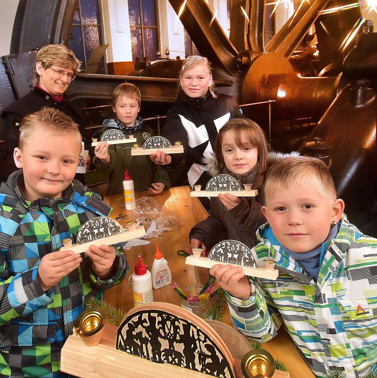 Weihnachtliche und bergbauliche Symbole wie Bergmann und Engel, Schwibbogen oder Pyramide werden in ihrer Entstehung und Verbindung zum Bergbau gezeigt und erläutert. Im zweiten Teil des Projekts gestaltet jeder eine Erinnerung zum Mitnehmen: das spezielle Habit eines Lugau-Oelsnitzer Bergmannes mit einem Bastelbogen oder in der Weihnachtszeit einen kleinen Schwibbogen.